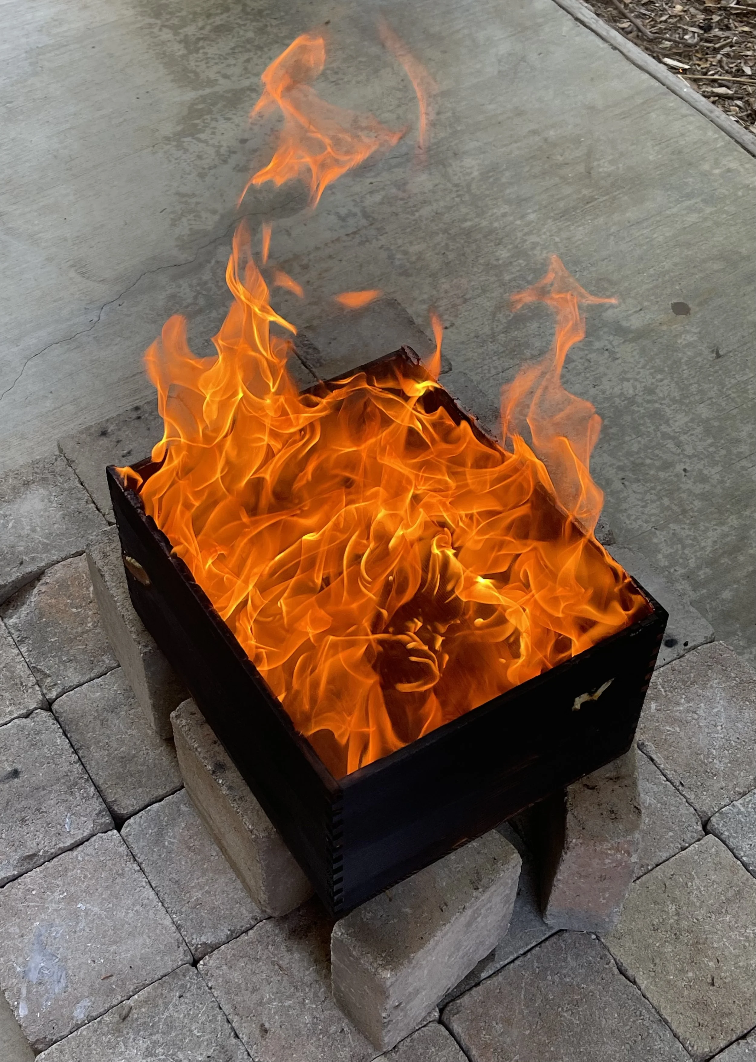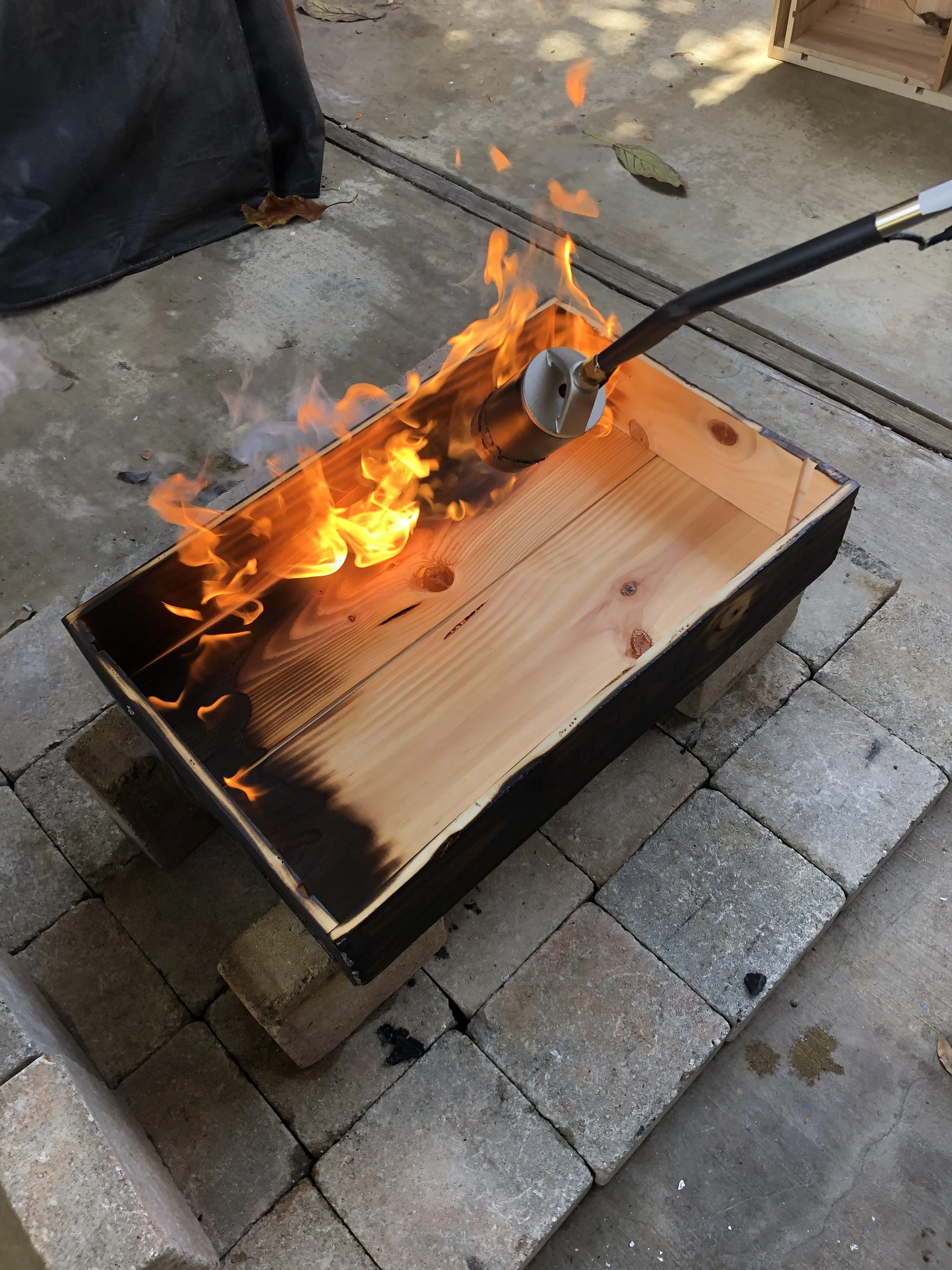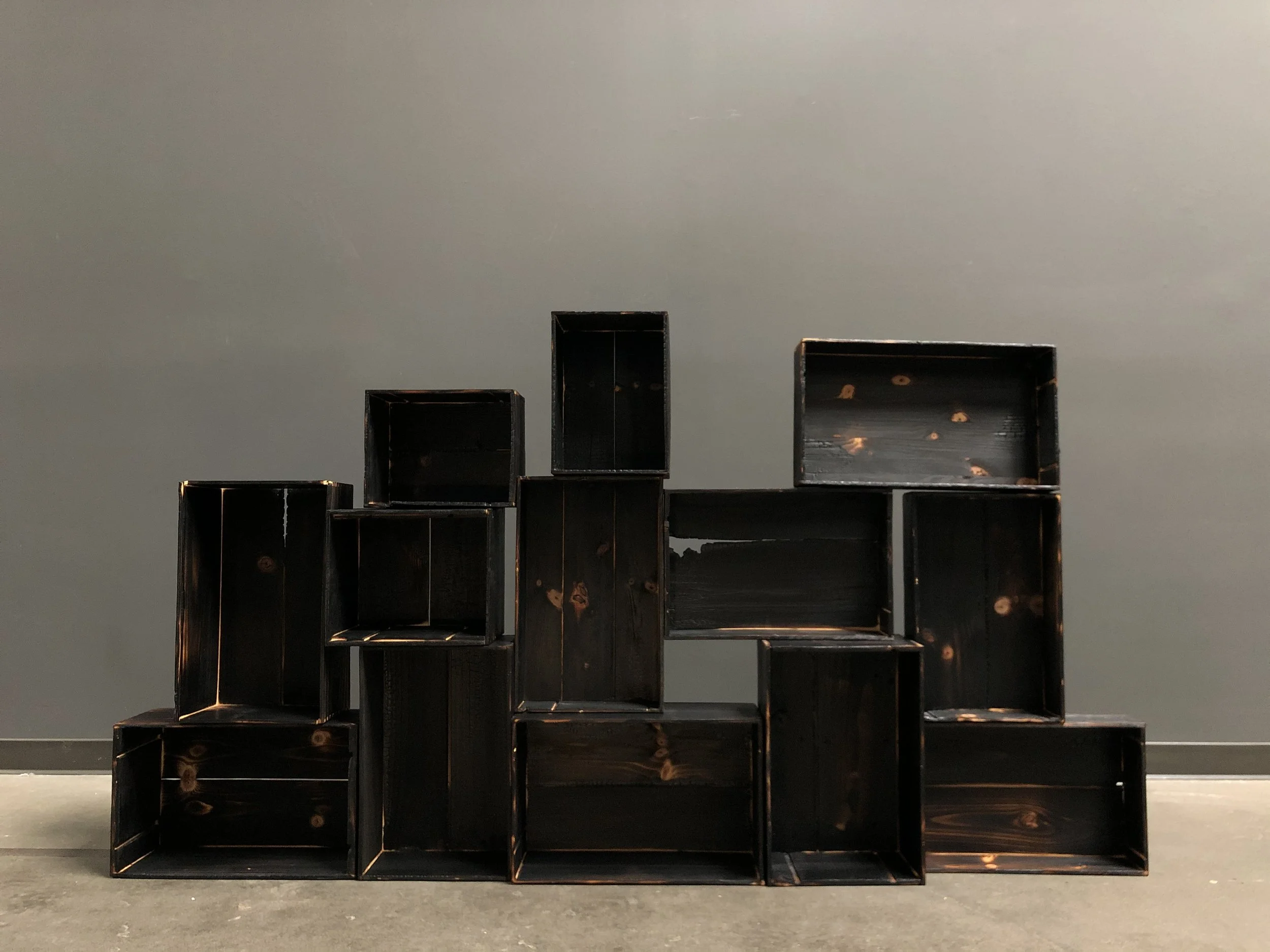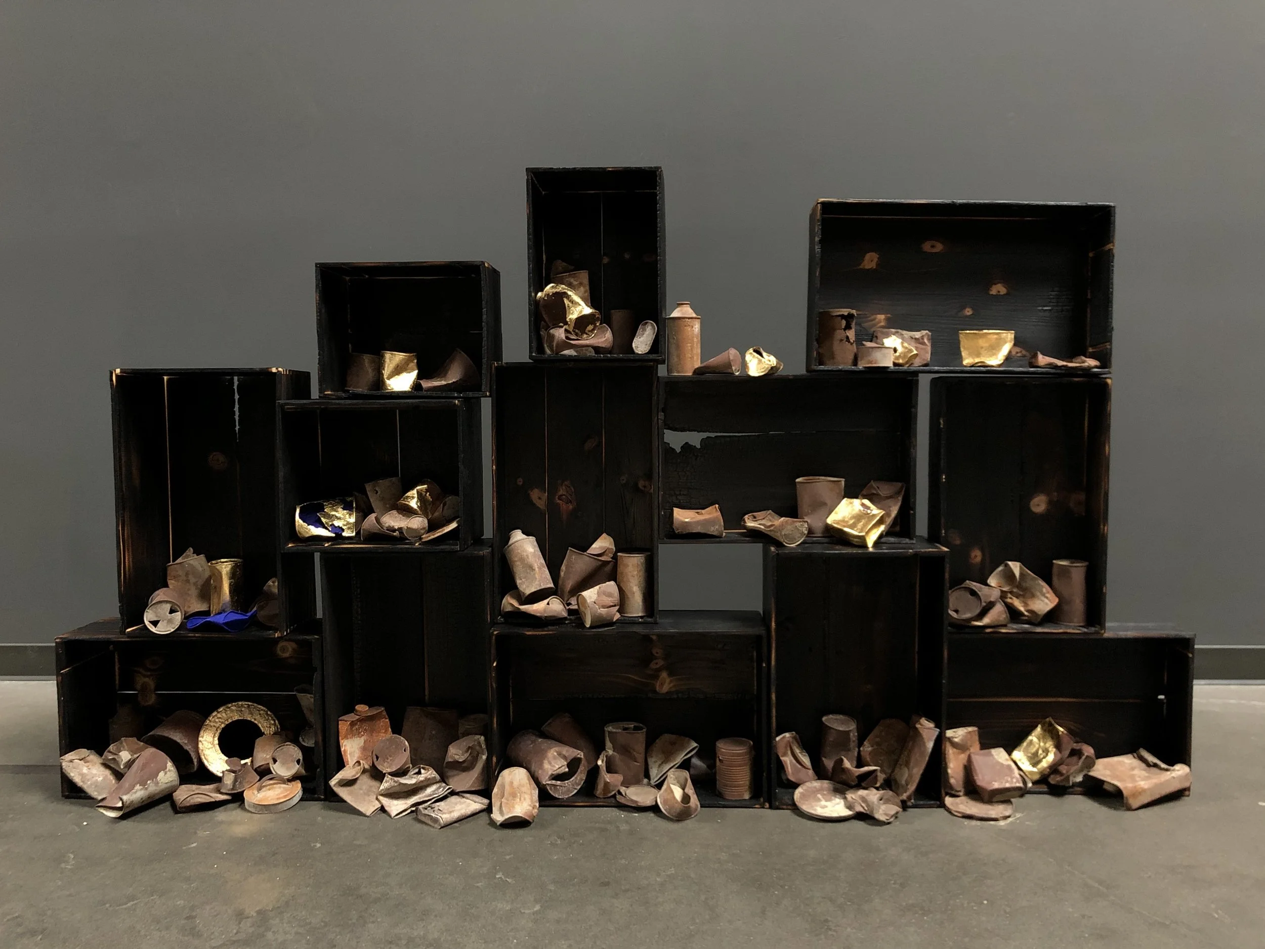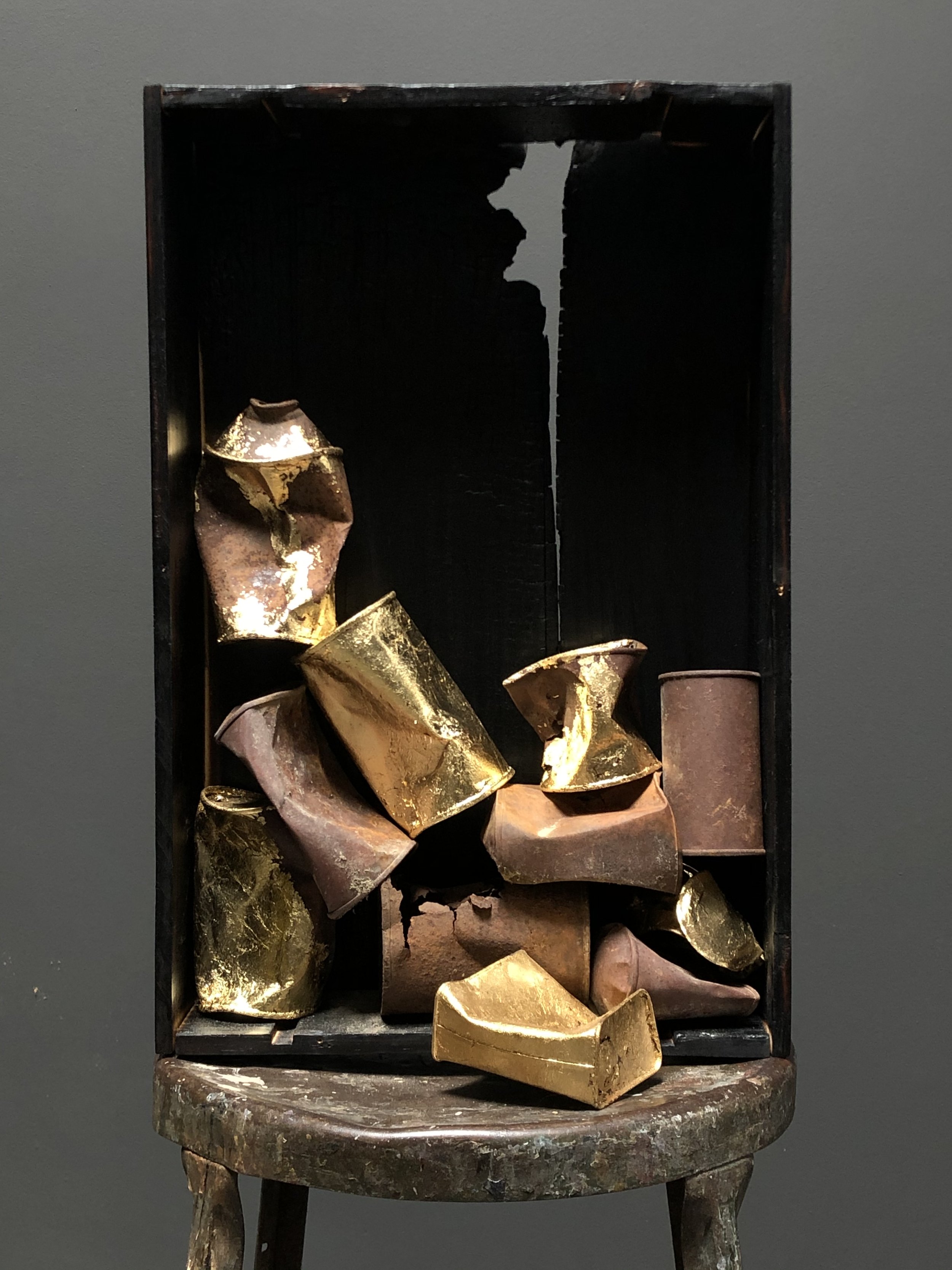 Fireboxes 1 | burnt wooden crates, rusted cans, gold leaf
